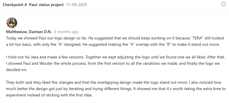 By making many logo iteration, I learned that feedback is very important. As a group we voted on the logos and also showed it to our teacher and his feedback helped us improve the final logo. I also learned how colors and fonts can show the feeling and core values of a brand.